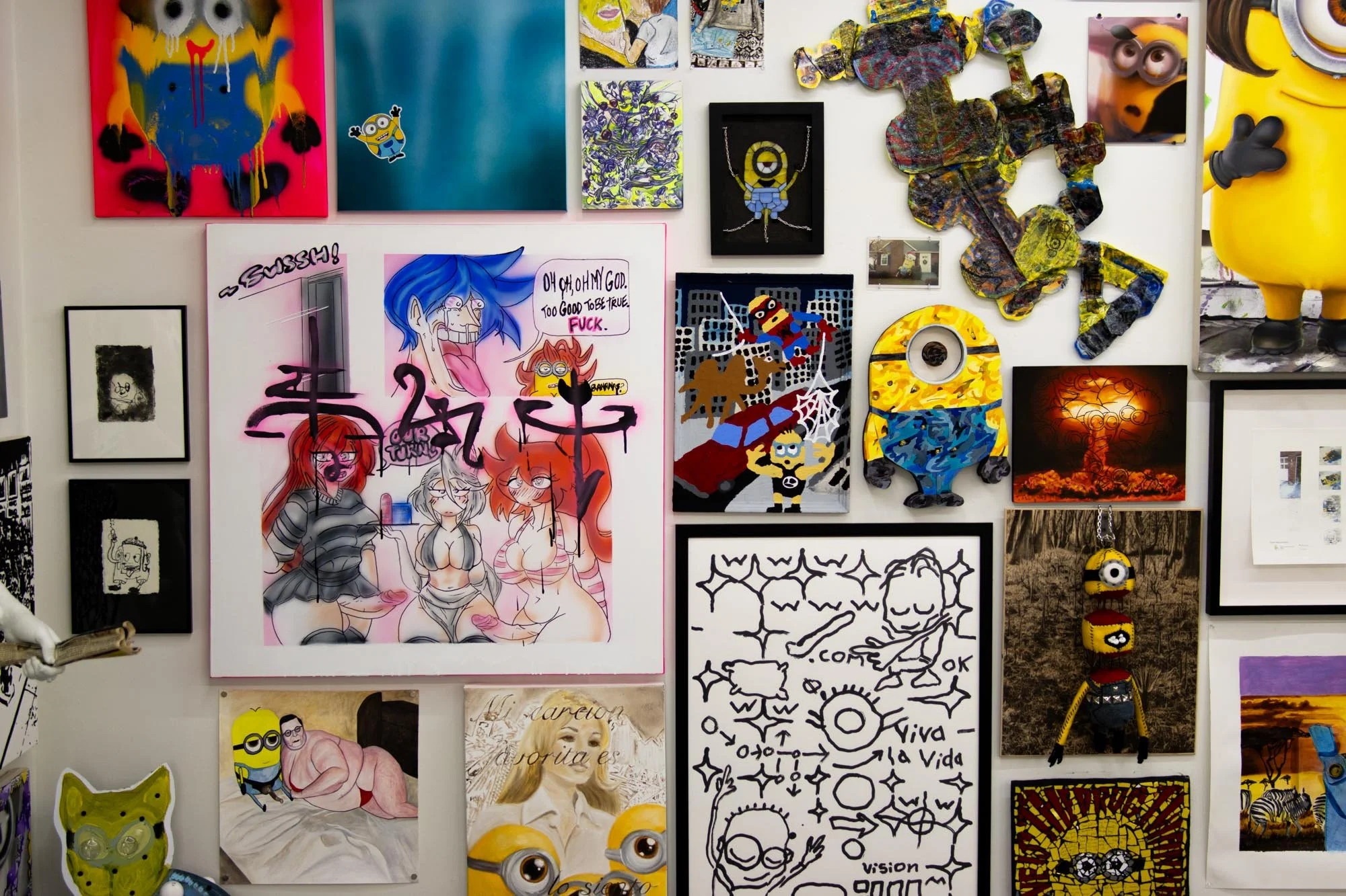 For this show, Weatherproof became a de-virtualized Know Your Meme page. Every surface—including the ceiling, occupied by Bavaria’s American Minion—holds Minion‑themed artwork.With 135 artists², the exhibition overwhelms your ability to distinguish one object from another; themes, content, and mediums bleed together, mimicking the experience of scrolling through every #minion post on TikTok. Two looping video works—Minion DVD by Parker Davis and Minion Video by Jacob Ciocci—pump out clashing audio, producing a babble worthy of their animated muses. In retrospect, the only pieces I can recall without photographic help are the most jarring: physical edgelord memes rendered IRL. By my count, at least 15 works show a Minion in a sexual encounter, proving once again the foundational rules of the internet.