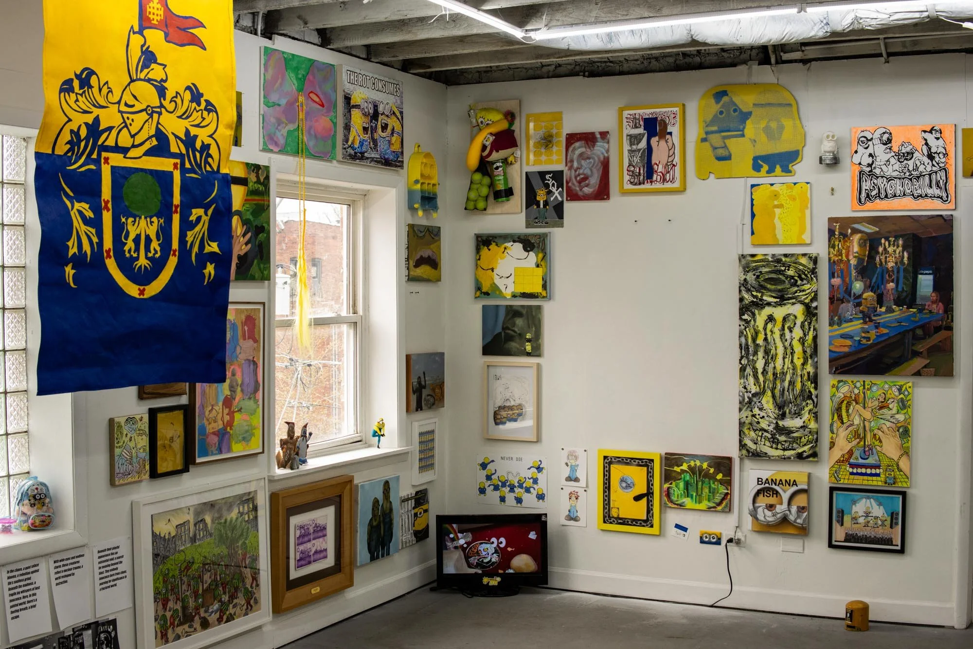Organized by NYC-based entity Pop Gun and curated by Gunner Dongieux and Trinity Bavaria, this wall-to-wall exhibition features work by 135 artists from around the world (but mostly from New York). A portmanteau of semiotics and Minion (creature), Minionotics draws upon both aspects of its namesake to cover every available surface of the gallery in artworks—converting the gray and white of Weatherproof into a circus of blue-and-yellow. Ostensibly a “synaptic mapping of Pop Gun’s art-world,” the only readily evident organizational logic seems to be one theme—all the artworks in the show have to draw from the concept of Minions.