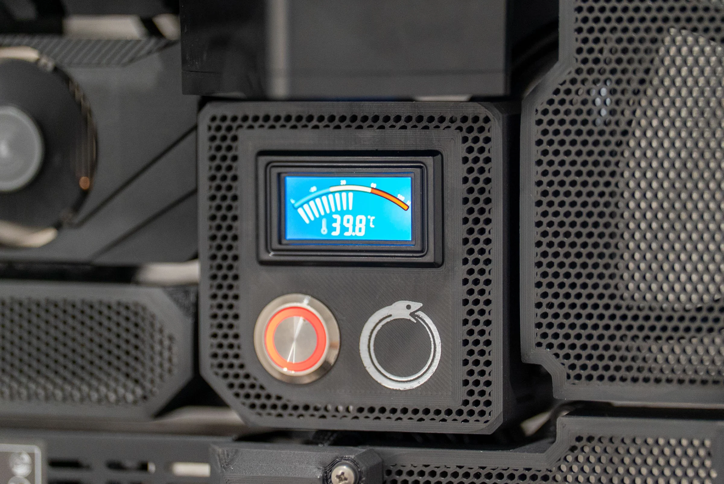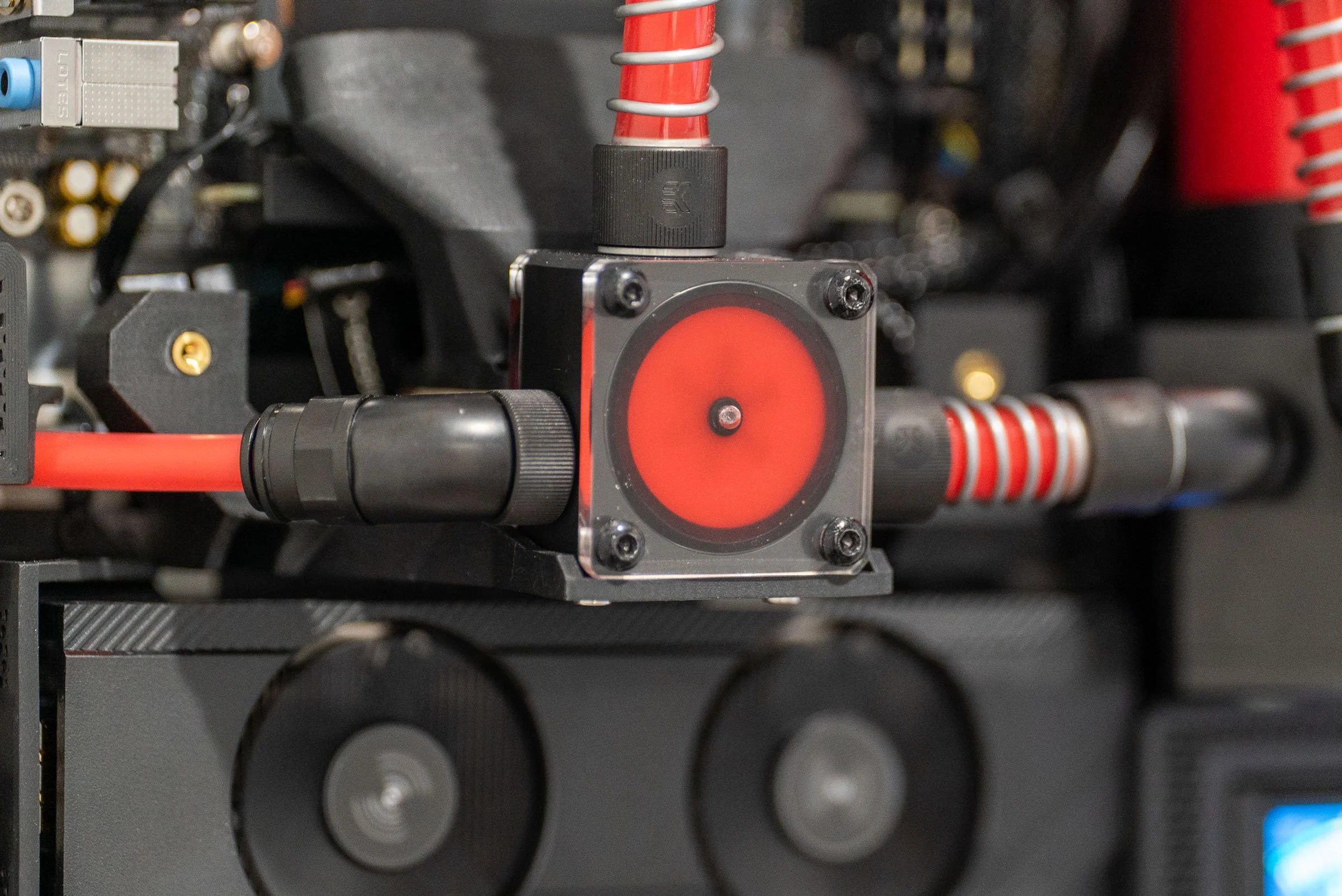 2025 - Cast aluminum, laser cut clear acrylic, brushed ACM panel, 3D-printed PLA, aluminum angle adapters, aluminum barb fittings, stainless steel hardware, polypropylene tubing, AMD Ryzen™ 5 5600, Gigabyte A520I, Gigabyte RTX™ 3050 OC Low Profile 6G, Corsair Vengeance® LPX DDR4-3200, Crucial® P3 Plus 500GB , Enhance ENP-7660L-OVT, EK Supremacy AX CPU block, XSPC QX5 Photon 170, Tygon® clear tubing, EK-CryoFuel Solid Scarlet Red, modified Alphacool Eisfluegel Flow Indicator, Alphacool ES Flow and Temperature Indicator, modified Alphacool Core temperature sensor, anti-kink springs, Noctua NF-A4x20, PCIE extender, 3D printed TPU, push-to-connect fittings, Bulgin momentary switch, laser cut aluminum brackets, aluminum cleats, heat-set inserts, M2F HDMI Cable, IEC C14 inlet, SPST Switch, Arch Linux, and modded Counterstrike Source.