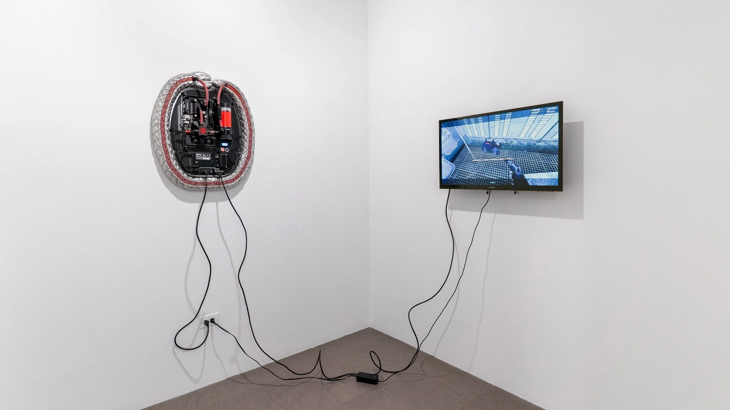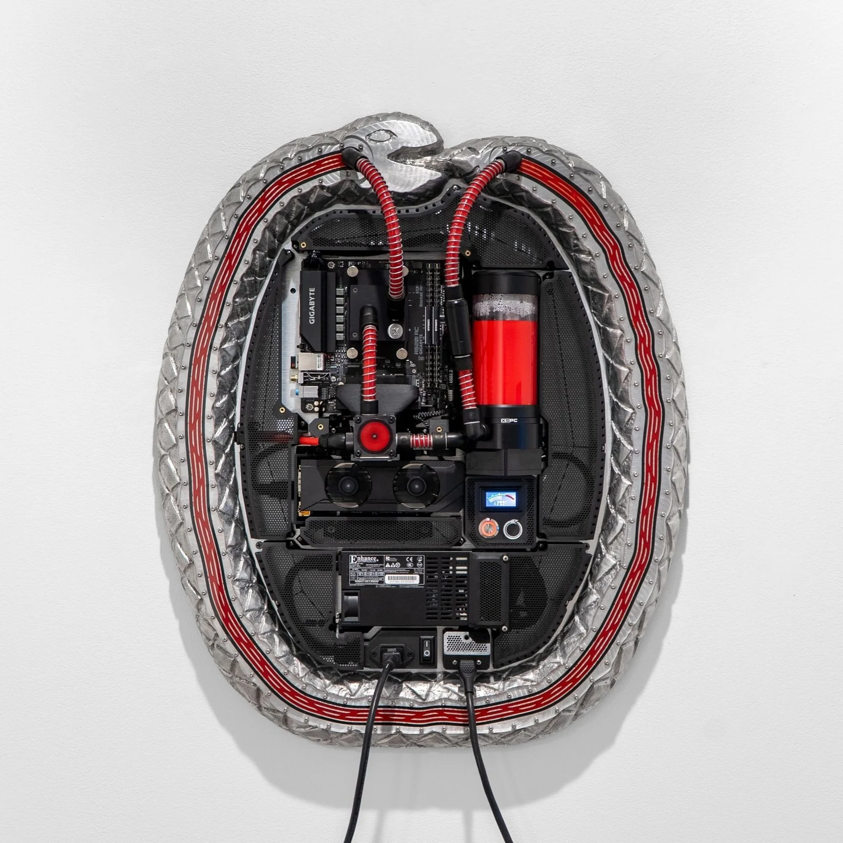 The main body of this media activated sculpture takes the form of a custom-built water-cooled PC contained within an aluminum casting of an ouroboros. The aluminum casting serves dual purposes as framing the PC and as the radiator for the water-cooling loop, the heat generated warming the form of the snake to body temperature. Running on the hardware is an ever-looping game of modded Counter Strike, set up so that two adversarial bots spawn in, fight, and die endlessly against the backdrop of non-descript battlefields.